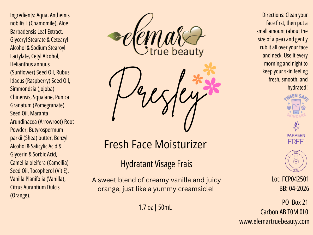 Created with love for our next generation of skincare lovers, Presley is a nourishing daily moisturizer made just for tweens. Inspired by my granddaughter and thoughtfully crafted by Elemar True Beauty, this formula is filled with wholesome, earth-born ingredients—gifts from God—chosen to care for young, delicate skin.